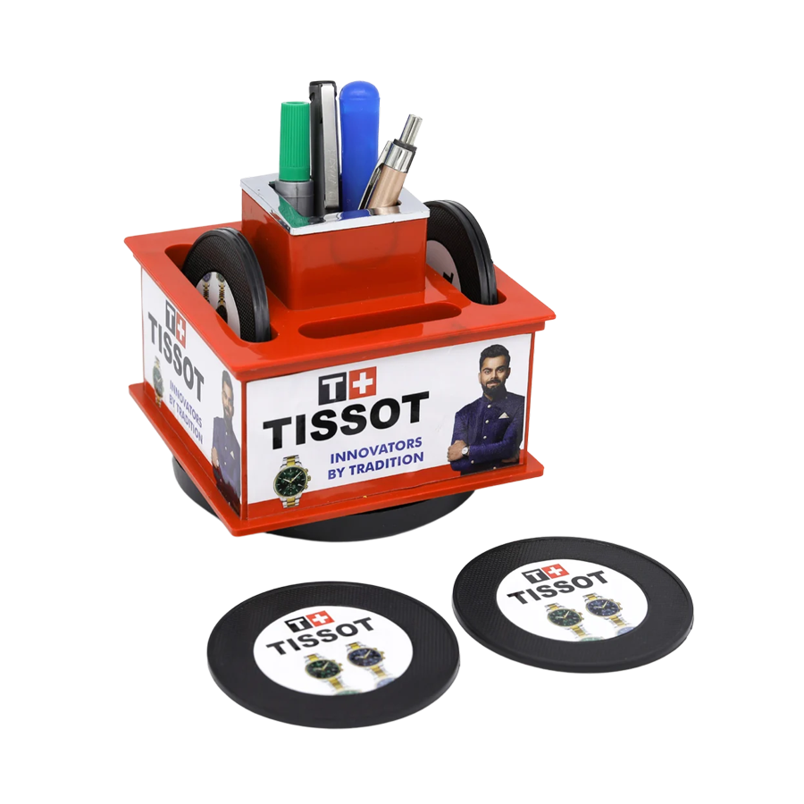 We offer revolving square shape pen stand WITH 6 COASTERS in various shapes size and colours. Cheapest way for free distribution to promote your brand or product