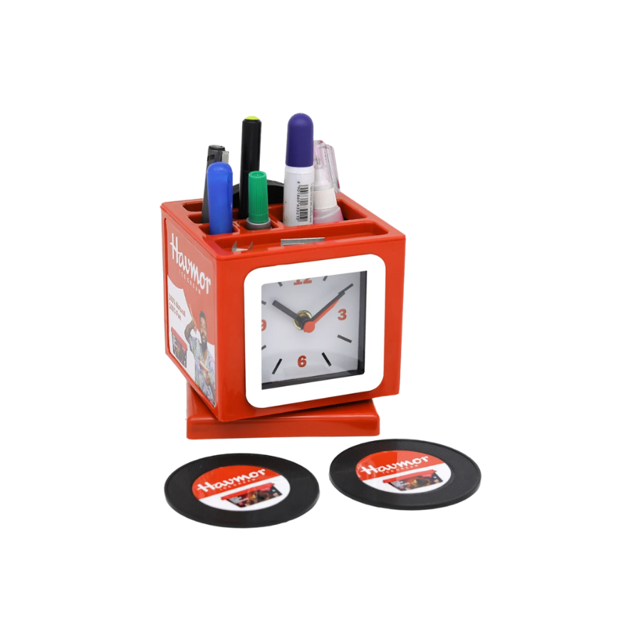 We offer table clock revolving pens stand with 6 coasters and chit pad in various shapes size and colours. Cheapest way for free distribution to promote your brand or product.
